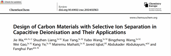 近日,喀什大学土木工程学院环境生态修复功能材料与技术团队负责人马杰教授为第一作者、硕士梁淑贞为第二作者,阿不都卡德尔·阿不都克尤木教授及潘芳慧副教授为共同通讯作者,喀什大学为第一单位,在ChemSusChem期刊发表题为“Design of Carbon Materials with Selective Ion Separation in Capacitive Deionisation and Their Applications” (DOI: 10.1002/cssc.202402563)的综述文章,全面分析了具有选择性离子分离功能的碳材料在电容去离子化(...