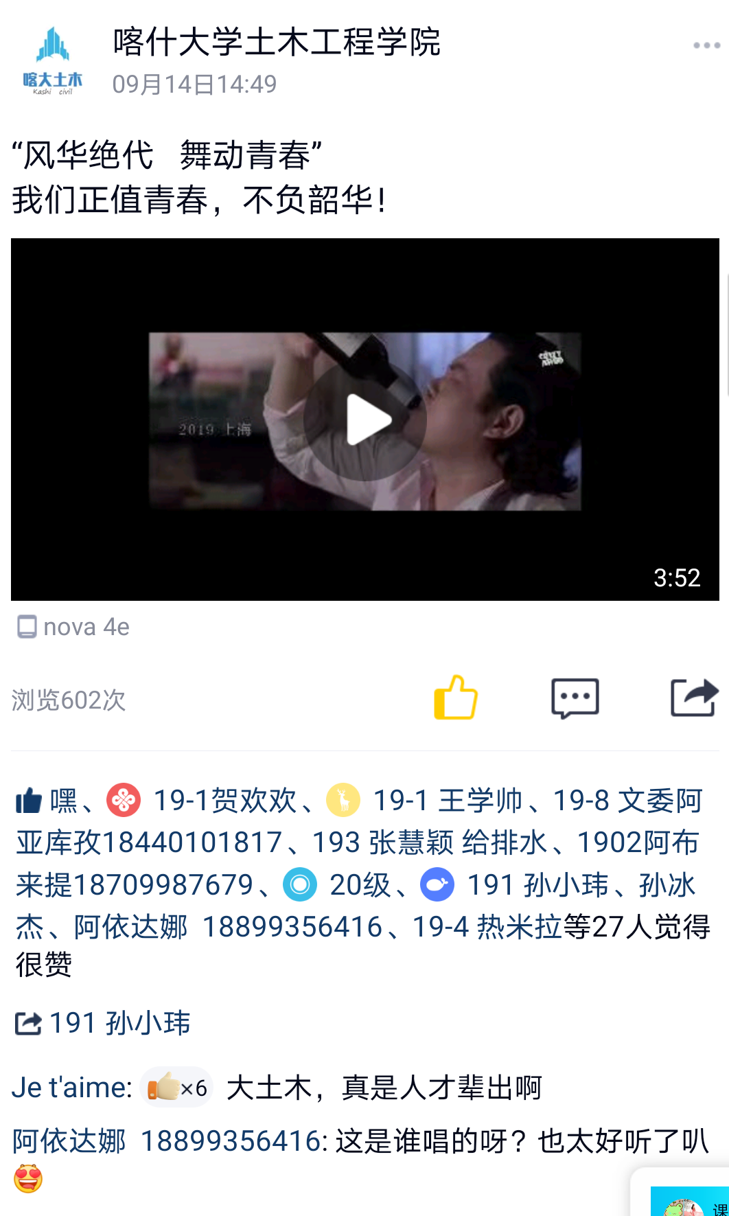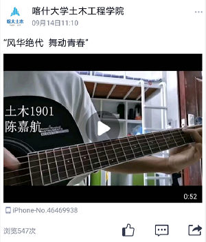 活动前期通过土木工程学院网宣平台进行积极宣传,各班同学踊跃报名参加,准备了多种多样的才艺表演:歌曲、吉他弹唱、街舞、民族舞等,于2020年9月9日-9月10日将各位参赛选手的作品依次在宣传平台上展示,最后由大众评审选出了五组获奖组合。