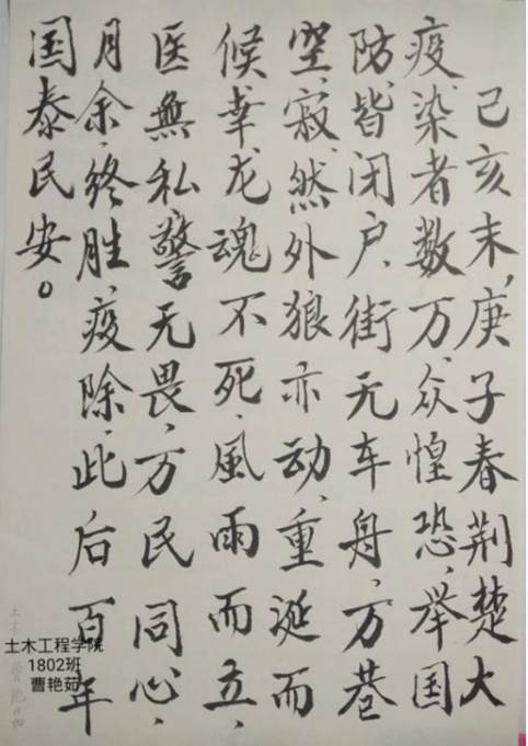 土木工程学院为推动普通话宣传力度,特进开展普通话作品征集活动,让同学们写好每一个汉字,用最简单的方式传递好普通话,传递好中华文化,让同学们深刻感受普通话在日常生活中的重要性。