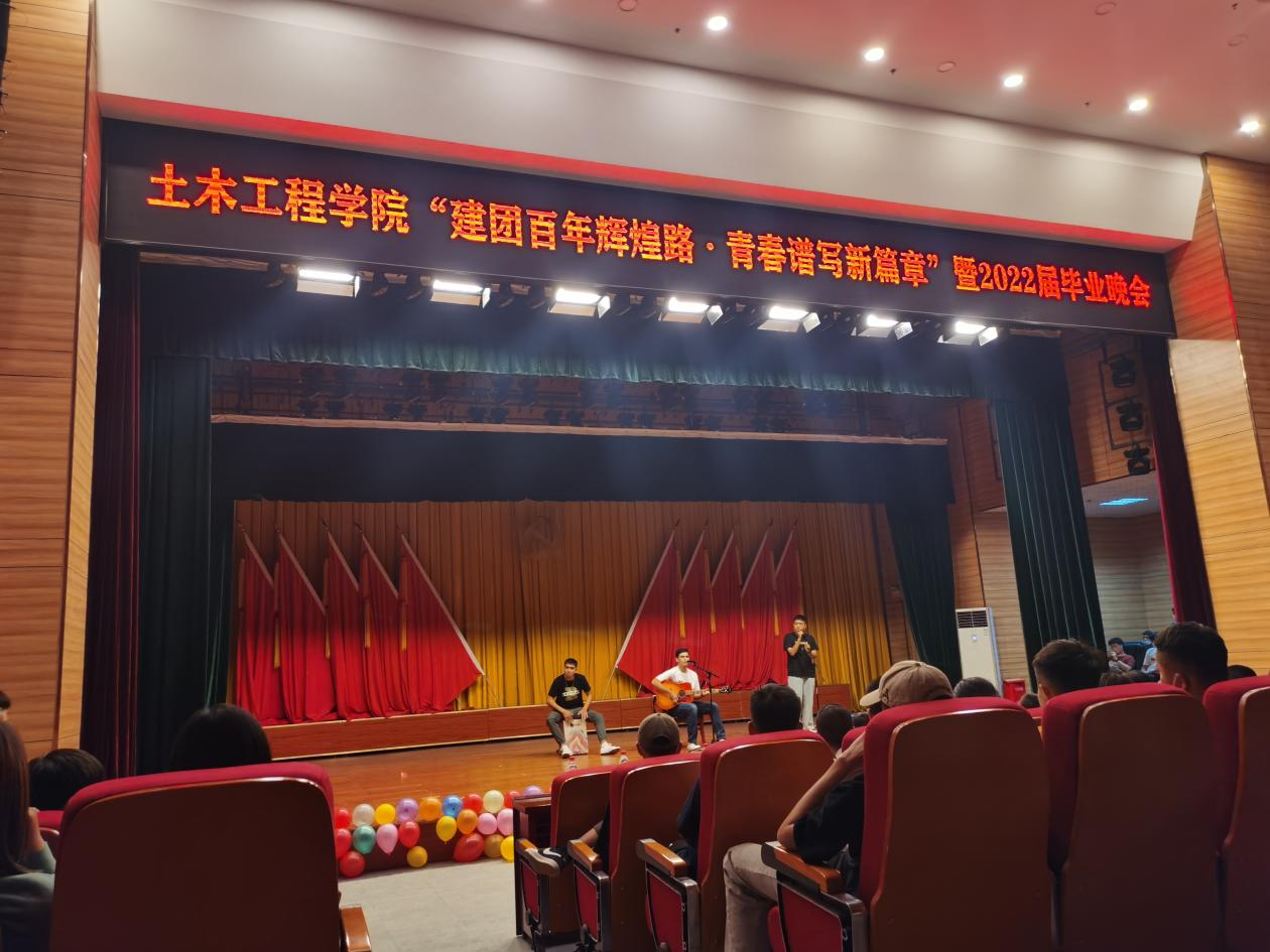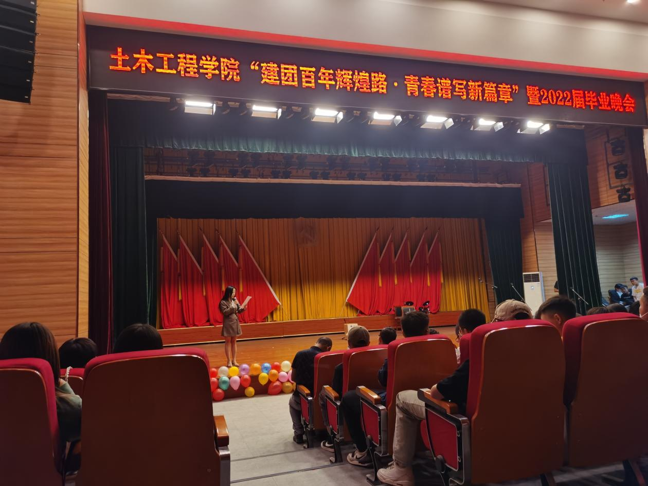 5月20日晚8点土木工程学院在喀什大学新泉校区大学生活动中心一楼报告厅举办了“建团百年辉煌路·青春谱写新篇章”2022届毕业生晚会。土木工程学院党委书记杨江平、院长黄俊革、毕业班班主任、辅导员以及全院教师、全体毕业生一起观看了晚会。