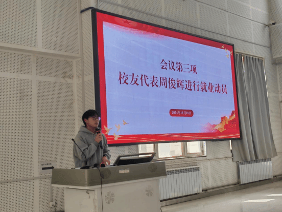 随后,2024届毕业生周俊辉和马忠洋分别上台进行了就业发言。他们结合自己的工作经历和职业发展,向毕业生们分享了宝贵的就业经验和心得。周俊辉同学从注重团队合作和沟通能力的重要性方面谈起,他建议毕业生们要在工作中注重团队协作,学会与同事和领导有效沟通。马忠洋鼓励在场的毕业生要持续保持学习状态,提升创新能力,充分发挥自身优势,不断提升自己的核心竞争力。