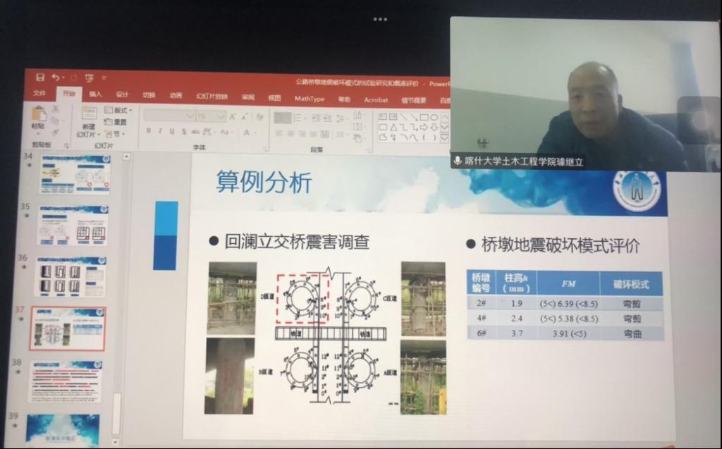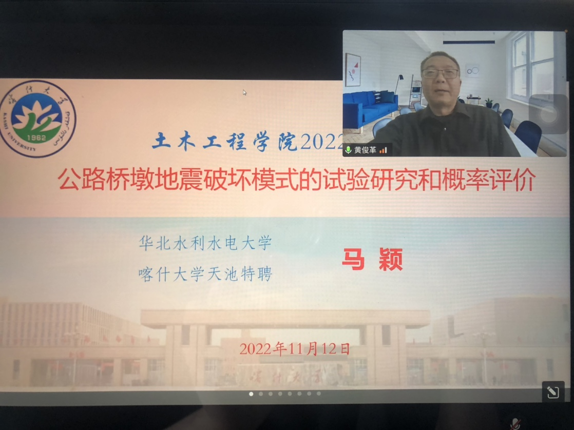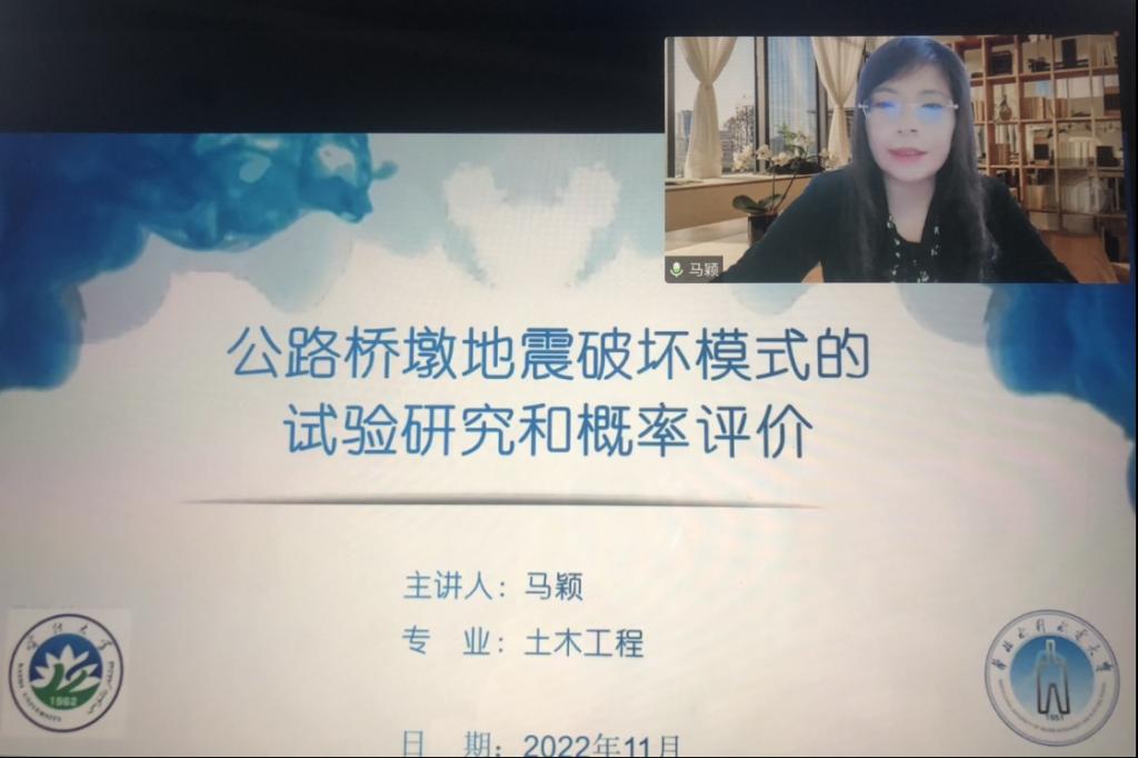 2022年11月12日,土木工程学院“天池特聘计划”马颖教授给土木工程学院师生作了题为“公路桥墩地震破坏模式的试验研究和概率评价”的线上学术报告。参会人员包括:土木工程学院院长黄俊革、副院长曹江林,“天池特聘计划”团队全体成员,各教研室主任、全体教师及土木工程专业和给排水科学与工程学生代表,共计100余人出席。报告会由黄俊革教授主持。