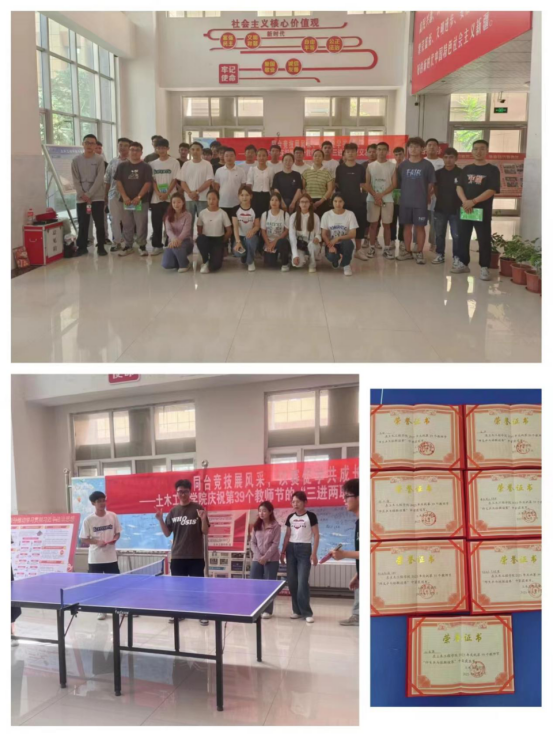 为庆祝第39个教师节,土木工程学院团委以“三进两联一交友”活动为载体,深入推进思政德育教育工作,9月7日下午学院团委组织开展了以“同台竞技展风采,有缘结友常相聚”为主题的庆祝第39个教师节师生联谊活动,一场别开生面的师生乒乓球联谊赛,在欢声笑语中拉开了帷幕,来自各教研室的专任教师们、辅导员们和各班级的乒乓小将们共聚学院一楼大厅,混合编组,同台竞技,尽显生命活力。赛场上,师生挥汗如雨,互相切磋球技,让人眼花缭乱,观赛的师生热烈交谈,互相学习借鉴,比赛精彩纷呈,现场掌声不断。学院党委副书记马英鼓励同学们积极参加各类体育运动,增强体魄,全面发展。