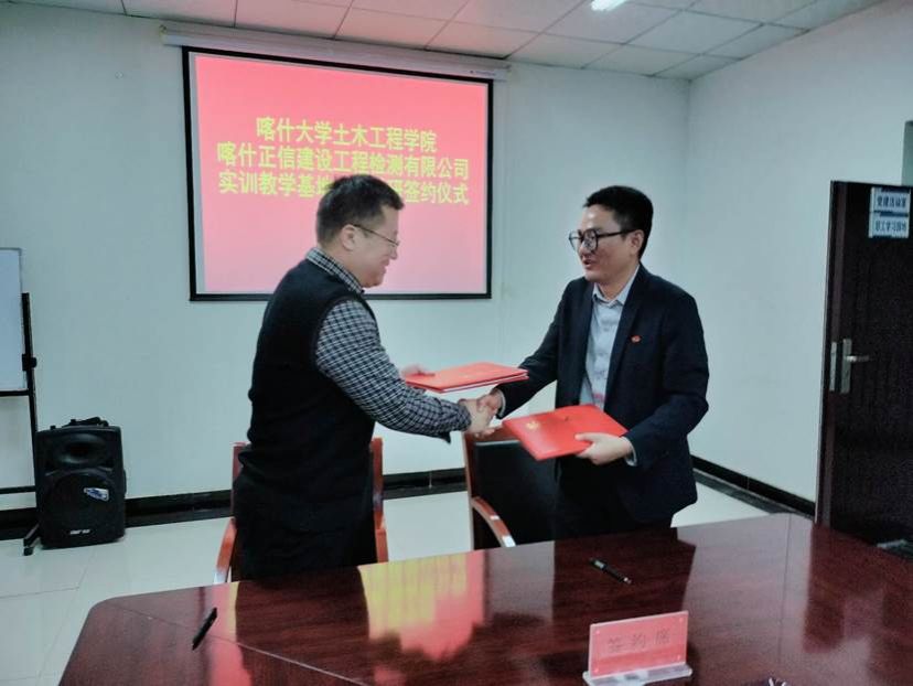 在喀什正信建设工程检测有限公司会议室,双方围绕实验室建设、人力资源共享、科研平台合作、学生实习实训、就业等方面深入交换了意见,隆重地举行校企合作框架协议签订和实习实训基地牌匾授牌仪式,喀什正信建设工程检测有限公司董事长李垂刊主持仪式。