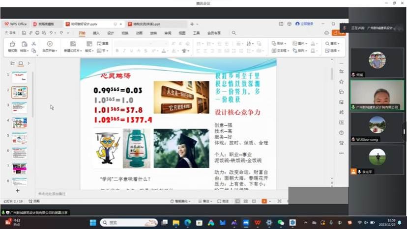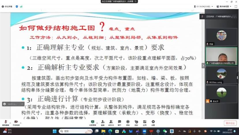 广州新城建筑设计有限公司注册一级建筑师、注册一级结构工程师李甡(线上参加),作为资深设计师,结合具体项目施工图系统地讲解了设计行业核心竞争力、设计管理流程、建筑及结构施工图画法、运用哪些标准图集和设计规范。